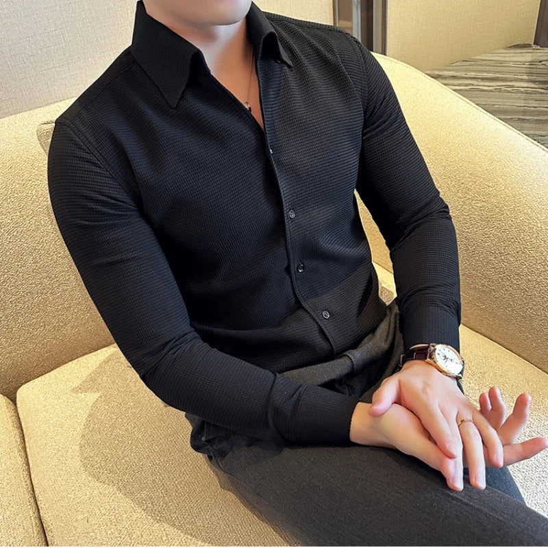 This tailored dress shirt combines a breathable cotton blend with a unique textured finish. Its single-breasted style and timeless fit make it a standout choice for the modern gentleman.